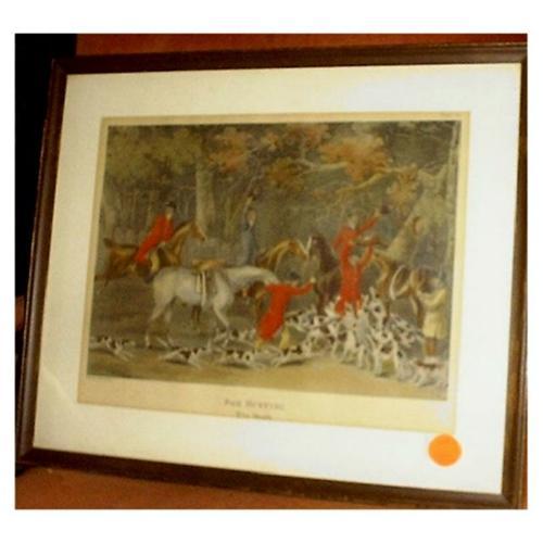 FOX HUNTING - THE START AND THE DEATH.<p>Matched pair of 1900's Stone Lithographs painted by James Pollard.<p>Fox Hunting - The Start, Plate #1. This picture shows 3 gentlemen (dressed in red coats, black hats and tan covered black boots) with their docked tail steeds, one of the gentlemen is letting the hounds out of the kennel.<p>Fox Hunting - The Death, Plate # 4. This picture shows one red coated gentleman hunter holding up the fox surrounded by the hounds, the hound master, 3 other gentlemen hunters, 5 docked tail horses, and one servant helper.<p>Matted and framed. Ready to hang.<p>Dimensions are 18" tall by 21 1/2" wide.<p>In very good condition.<p>Hard to find lithographs with these viberant colors and no fading through the years. In orginal magohony wood frames. Some nicks in the frame from age. Some yellowing on the lithographs. Horses colors are bay, black, grey and a chestnut.