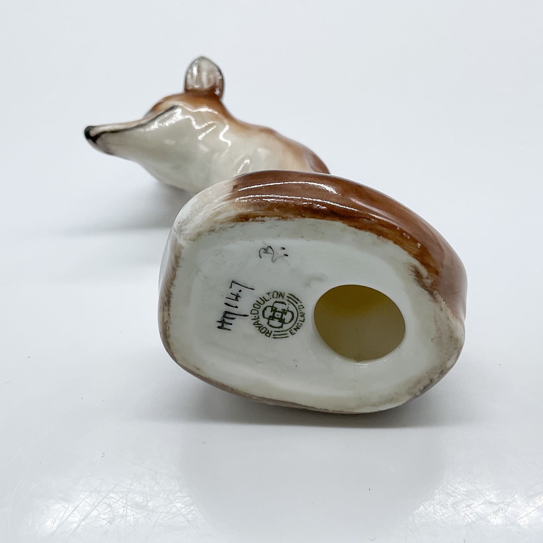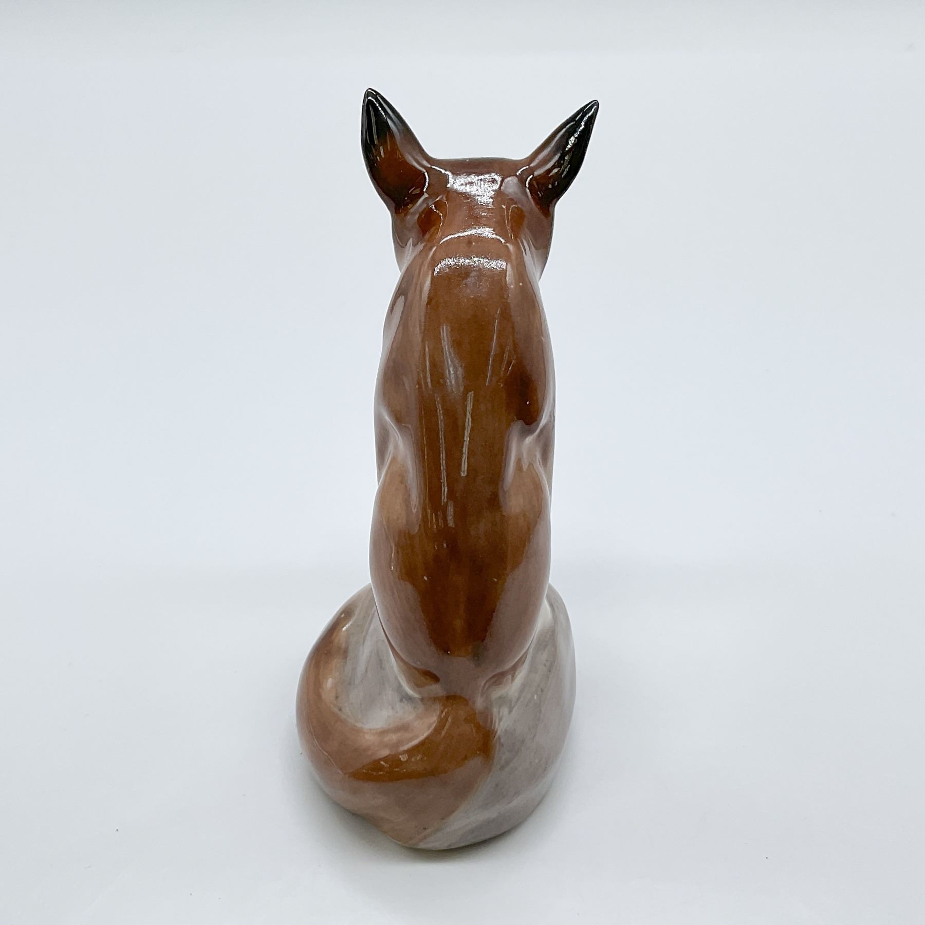 Style One - small, hand painted figure of a sleepy fox seated on a rock. Tail curled against the side of the rock. Brown and black colorations. Royal Doulton backstamp.