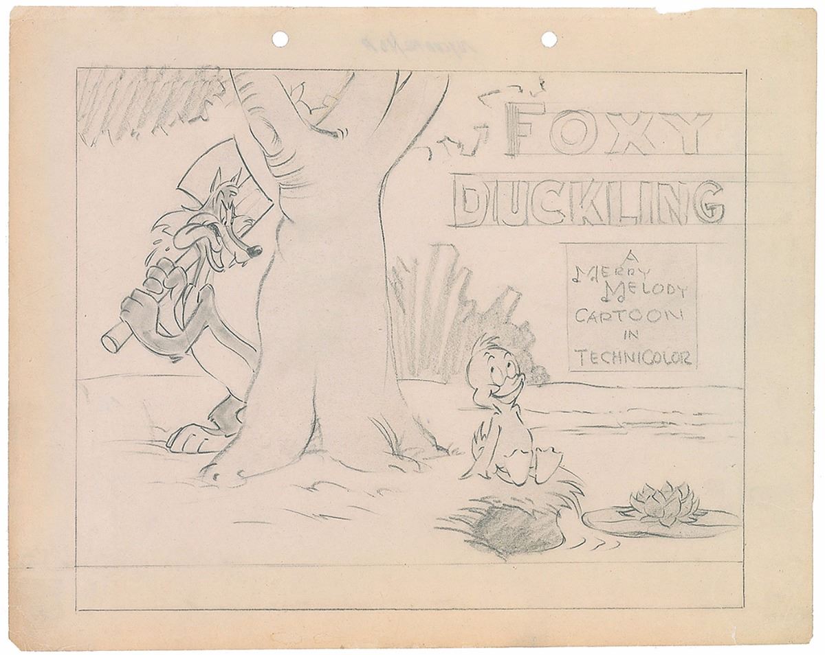 (Warner Brothers Studios, 1947) Original production layout drawing featuring Fox and Duckling from The Foxy Duckling, used in the creation of the lobby card for the Merrie Melodies Technicolor short. Accomplished in graphite on untrimmed 12 x 9.5 animation paper. Total image measures 10 x 8. In fine condition, with light scattered creases and some trivial edge chips and tears.