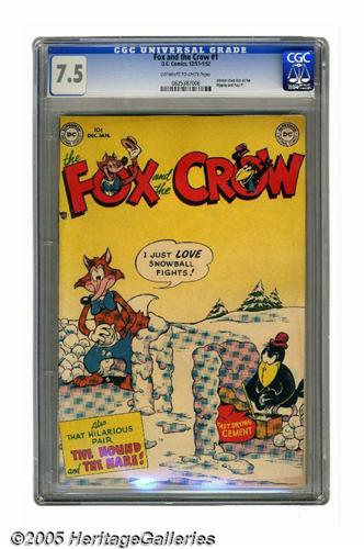 <B>Fox and the Crow #1 (DC, 1951) CGC VF- 7.5 Off-white to white pages.</B></I> DC issues from the early 1950s are generally tough finds in high grade, and DC "funny" books seem even tougher to acquire. This is just about as nice a copy as you'll find; CGC's census currently lists just one copy with a higher grade. The inside cover has an ad for <B>Flippity and Flop</B></I> #1. Overstreet 2005 VF 8.0 value = $700. CGC census 5/05: 1 in 7.5, 1 higher.