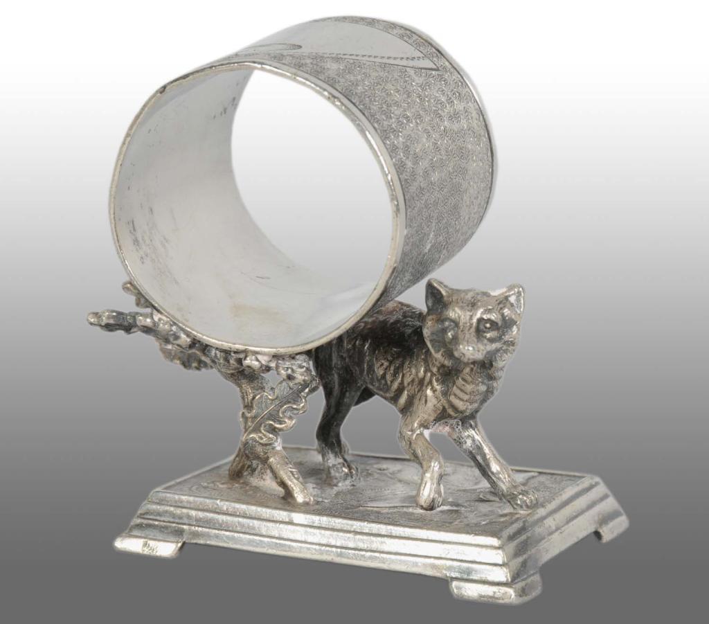 Marked "Derby Silver Co." and numbered "364". Depicts raised rectangular base supporting fox by bush under napkin holder. Condition (Very Good - Excellent).