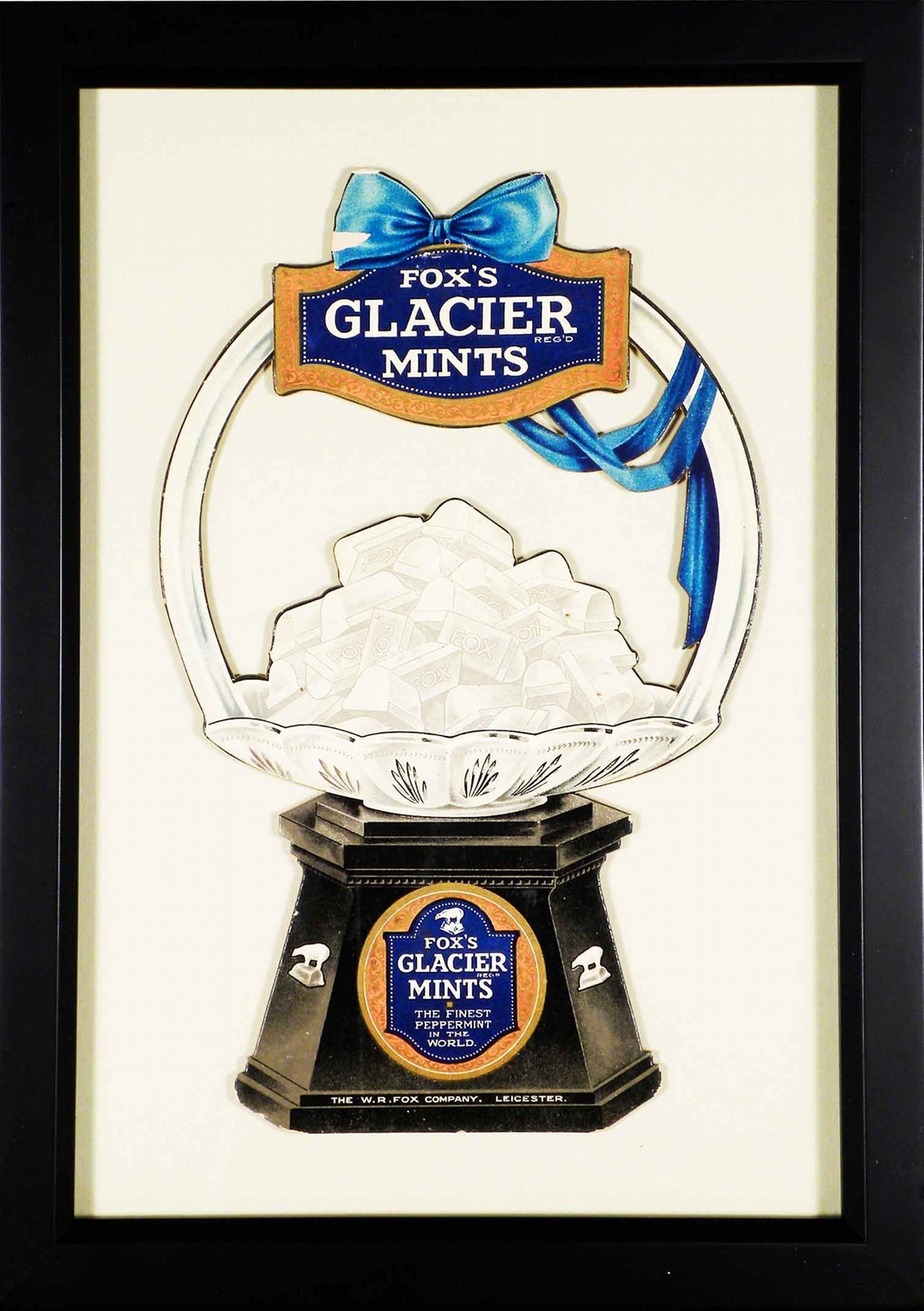 Fox's Glacier Mints Die Cut Cardboard Sign. Depicting crystal basket on pedestal filled with mints. Framed under glass. Minor paper loss on left side of bow otherwise excellent condition. 6 3/4 X 10 1/2 inches only.