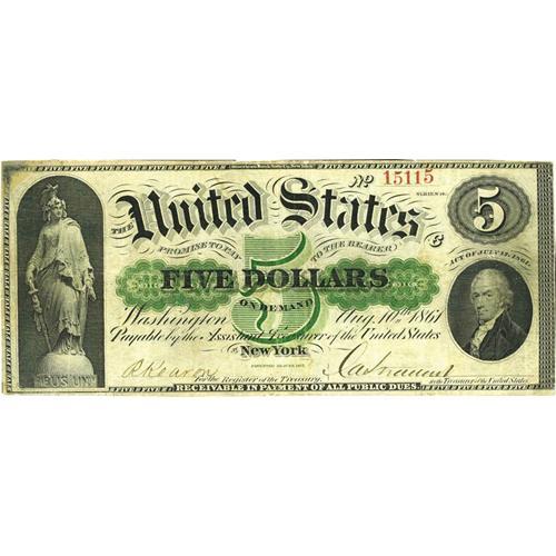 <B>Fr. 1 $5 1861 Demand Note Fine.</B></I> An old friend returns after a long hiatus. This note was last sold by CAA in June of 1994. Not much has changed about the note. The upper left corner tip repair still remains. Besides that the note is wholly original with strong signatures and pleasing color throughout.