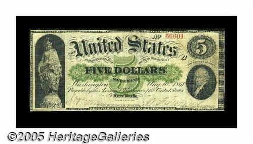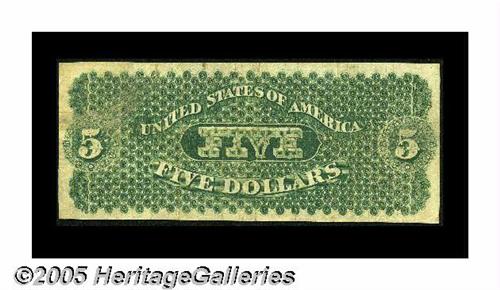 <B>Fr. 1 $5 1861 Demand Note Fine.</B></I> This solid Fine example looks attractive and problem-free at first glance on the face, but the back reveals an old repair where the upper right corner was detached and reattached. The left end shows a small edge split repair, as well. With a little expert restoration, this early "Greenback" would look much better.