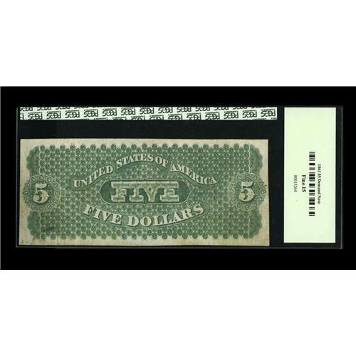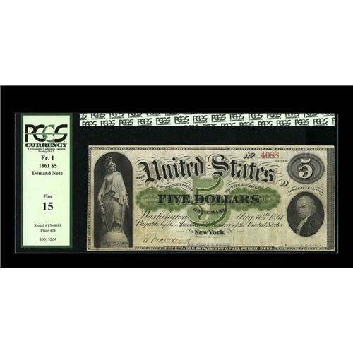 <B>Fr. 1 $5 1861 Demand Note PCGS Fine 15.</B></I> Better margined than most Demand Notes, and apparently free of the splits, holes and repairs that plague this early weak-paper issue. The right-hand signature has faded, but the left signature remains strong.