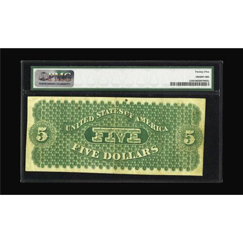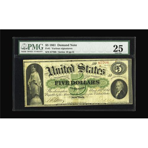 <B>Fr. 1 $5 1861 Demand Note PMG Very Fine 25.</B></I> Beautifully margined for a Demand Note, without problems or repairs of any kind save for a couple of light spots that could well be as old as the note itself. It's a well signed, and extremely attractive note of a type that seems undervalued when compared to other areas of US Currency. The book <I>100 Greatest American Currency Notes</B></I> ranks this design type at No. 38.<BR><I>From The Troy Wiseman Collection</B></I>
