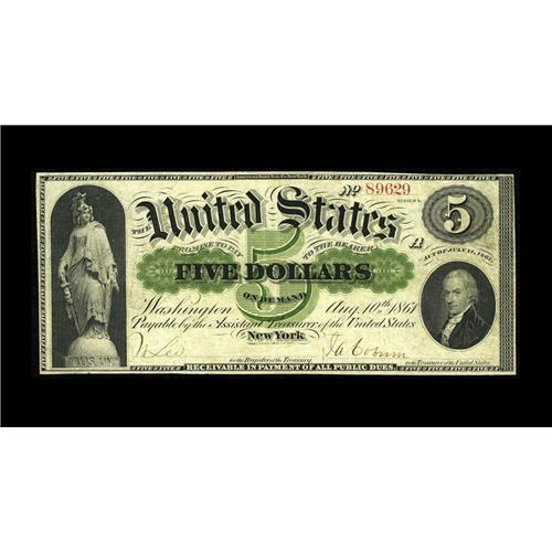 <B>Fr. 1 $5 1861 Demand Note Very Fine.</B></I> A rock solid example of the grade, with strong pen signatures, perfect color and terrific eye appeal. The margins are close in a few places, but they are free of the design at all points. In our opinion, Demand Notes have always been and continue to be extremely undervalued.