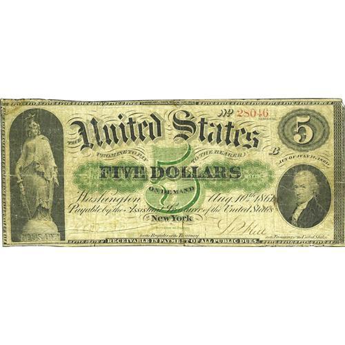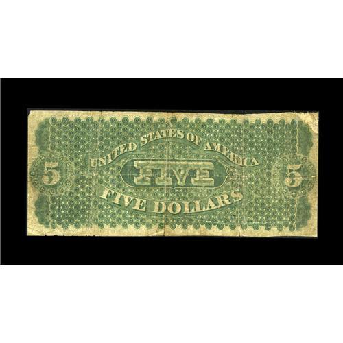 <B>Fr. 1 $5 1861 Demand Note Very Good.</B></I> The green ink remains dark, while the note was mounted at one time with stamp hinges. A couple of small repairs are also noted and there are several edge tears with the longest being approximately a quarter of an inch.
