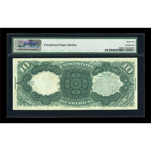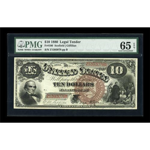 <B>Fr. 100 $10 1880 Legal Tender PMG Gem Uncirculated 65 EPQ.</B></I> Obvious paper originality highlights this Gem Large Brown Seal Red Serial Number Jackass Ten. The margins on both sides are good enough to have supported a higher grade. A very nice type note.<BR><BR><b>Shipping:</b> Coins & Currency (<a target="_blank" href="http://www.heritageauctions.com/common/shipping.php">view shipping information</a>)