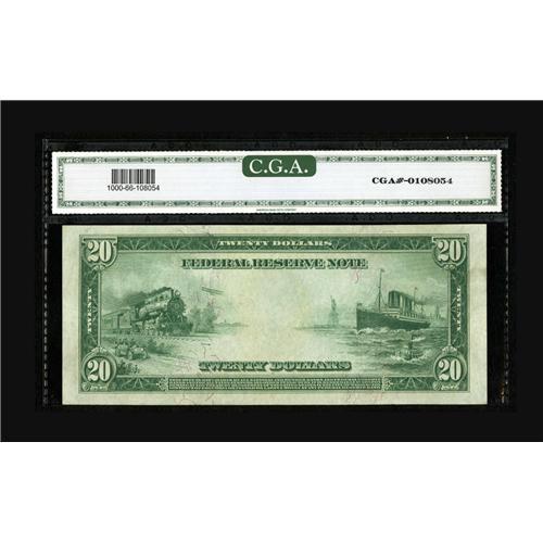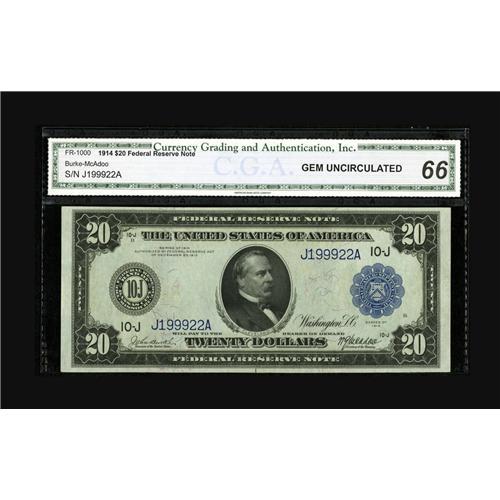 <B>Fr. 1000 $20 1914 Federal Reserve Note CGA Gem Uncirculated 66.</B></I> Behemoth margins are noticed on this KC $20 FRN. This is a new addition to the census which has less than ten examples listed in new.<BR><BR><b>Shipping:</b> Coin/Currency (<a target="_blank" href="http://www.heritageauctions.com/common/shipping.php">view shipping information</a>)