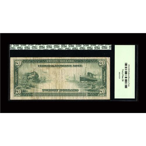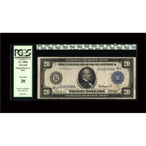 <B>Fr. 1000 $20 1914 Federal Reserve Note PCGS Very Fine 20.</B></I> This piece has not yet been included in the census, though only about fifty notes are known in total. This piece is pleasing and original with a few too many folds to be called EF.