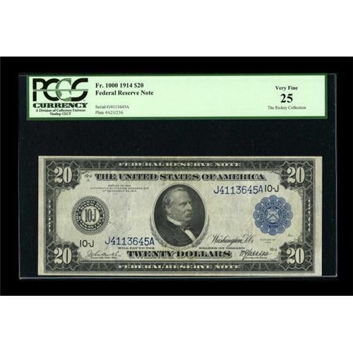 <B>Fr. 1000 $20 1914 Federal Reserve Note PCGS Very Fine 25.</B></I> Some embossing remains visible on this Kansas City note.<BR><BR><b>Shipping:</b> Coins & Currency (<a target="_blank" href="http://www.heritageauctions.com/common/shipping.php">view shipping information</a>)