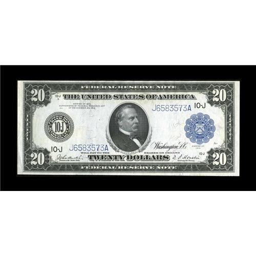 <B>Fr. 1002 $20 1914 Federal Reserve Note Choice About New.</B></I> This is an embossed KC $20 with original surfaces. It is also one of the nicest examples of this Friedberg number that has around 40 reported in the census.<BR><BR><b>Shipping:</b> Coins & Currency (<a target="_blank" href="http://www.heritageauctions.com/common/shipping.php">view shipping information</a>)