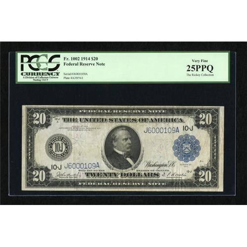 <B>Fr. 1002 $20 1914 Federal Reserve Note PCGS Very Fine 25PPQ.</B></I> The paper is exceptionally bright for the grade.<BR><BR><b>Shipping:</b> Coins & Currency (<a target="_blank" href="http://www.heritageauctions.com/common/shipping.php">view shipping information</a>)