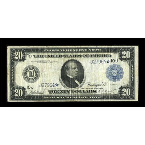 <B>Fr. 1002 $20 1914 Federal Reserve Star Note Fine.</B></I> An attractive piece which is as nice as any Fr. 1002 star ever offered at public sale. It is clean and problem free, with good color and eye appeal for the grade. <BR><I>From The Lawrence O'Neal Collection</B></I><BR><BR><b>Shipping:</b> Coins & Currency (<a target="_blank" href="http://www.heritageauctions.com/common/shipping.php">view shipping information</a>)