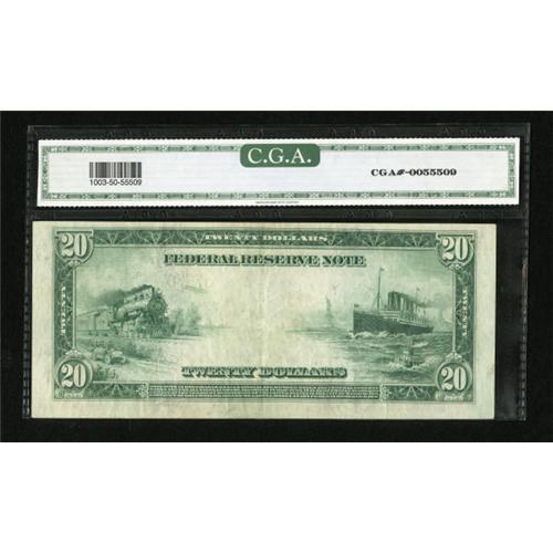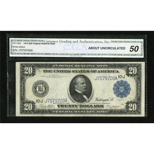 <B>Fr. 1003 $20 1914 Federal Reserve Note CGA About Uncirculated 50.</B></I> Only one other example of this scarce district has shown up since the end of 2005. This piece is a pleasingly original piece with a lone center bend.<BR><BR><b>Shipping:</b> Coins & Currency (<a target="_blank" href="http://www.heritageauctions.com/common/shipping.php">view shipping information</a>)