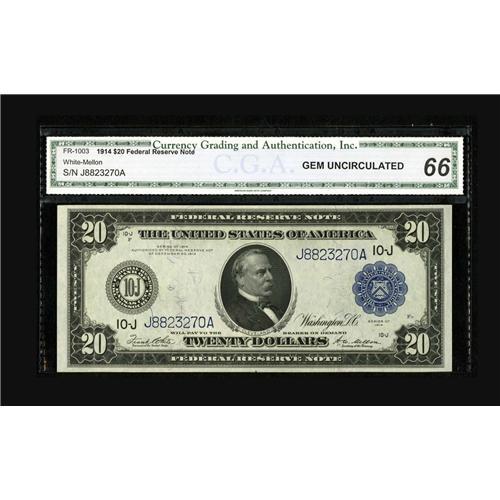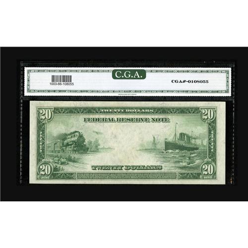 <B>Fr. 1003 $20 1914 Federal Reserve Note CGA Gem Uncirculated 66.</B></I> Terrific margins grace this bright $20 FRN that may well be the finest known off this district. New to the census, but within a known run of new notes.<BR><BR><b>Shipping:</b> Coin/Currency (<a target="_blank" href="http://www.heritageauctions.com/common/shipping.php">view shipping information</a>)