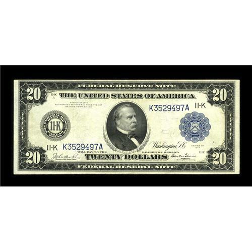 <B>Fr. 1005 $20 1914 Federal Reserve Note Very Fine.</B></I> This Dallas Burke-Glass $20 is an extremely rare note in all grades, as the census shows just seven examples reported to date and that does not include this note. With the demand for better Friedberg numbers continuing unabated, expect to see some strong bidding on this lot.<BR><BR><b>Shipping:</b> Coins & Currency (<a target="_blank" href="http://www.heritageauctions.com/common/shipping.php">view shipping information</a>)