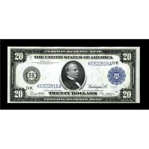 <B>Fr. 1007 $20 1914 Federal Reserve Note Choice New.</B></I> This note and the next come from a Dallas district cut sheet which we sold almost ten years ago. Both notes are crackling fresh and gem but for the close trim at the bottom.<BR><BR><b>Shipping:</b> Coins & Currency (<a target="_blank" href="http://www.heritageauctions.com/common/shipping.php">view shipping information</a>)