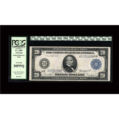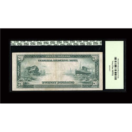 <B>Fr. 1007 $20 1914 Federal Reserve Note PCGS Very Fine 30PPQ.</B></I> This attractive and original issue faces up like the best EF's. The margins are full and the paper is nearly unhindered by soil.