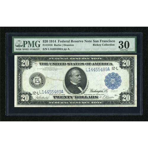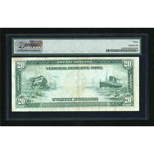 <B>Fr. 1010 $20 1914 Federal Reserve Note PMG Very Fine 30.</B></I> This new note for the census has a grade that will put it in the top half for this Friedberg number. <BR><BR><b>Shipping:</b> Coins & Currency (<a target="_blank" href="http://www.heritageauctions.com/common/shipping.php">view shipping information</a>)