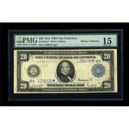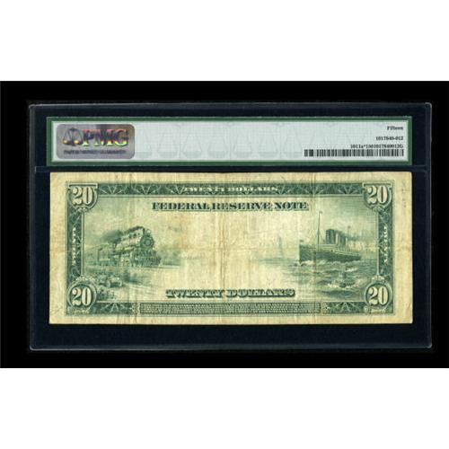 <B>Fr. 1011a $20 1914 Federal Reserve Star Note PMG Choice Fine 15.</B></I> This is one of only 15 stars in the census for this Friedberg number. It has been over a year since one of these last crossed the auction block.<BR><BR><b>Shipping:</b> Coins & Currency (<a target="_blank" href="http://www.heritageauctions.com/common/shipping.php">view shipping information</a>)