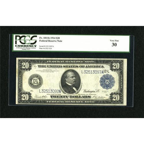 <B>Fr. 1011b $20 1914 Federal Reserve Note PCGS Very Fine 30.</B></I> This popular type "b" shows a smaller 12-L in the lower left corner.<BR><I>From The Kansas City Collection</B></I><BR><BR><b>Shipping:</b> Coins & Currency (<a target="_blank" href="http://www.heritageauctions.com/common/shipping.php">view shipping information</a>)