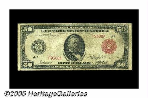 <B>Fr. 1017a $50 1914 Red Seal Federal Reserve Note Fine.</B></I> A really rare Red Seal $50 with under ten examples known. No "b" type Red Seal $50's were issued by Atlanta, which makes this a one-numbered type. Years could pass by without another opportunity to acquire this note. It's a solid piece with terrific color for the grade and no flaws, except for a scattering of a half-dozen very small pinholes. A truly rare note.
