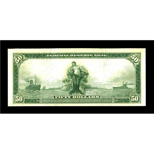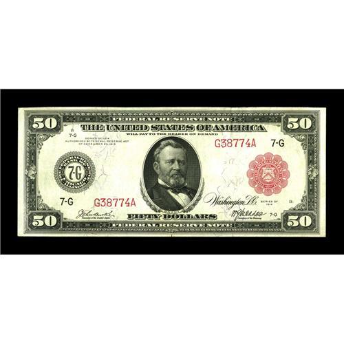 <B>Fr. 1018b $50 1914 Red Seal Federal Reserve Note Extremely Fine.</B></I> This former Jim Thompson note is one of only eleven documented for this Friedberg number. The folds are light on this example that has a very nice looking red overprint. This note has been graded VF and AU in the past, but we feel that it is a XF note.<BR><I>From The Bill and Kathy Stella Currency Collection</B></I><BR><BR><b>Shipping:</b> Coin/Currency (<a target="_blank" href="http://www.heritageauctions.com/common/shipping.php">view shipping information</a>)