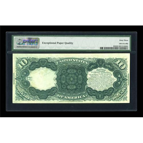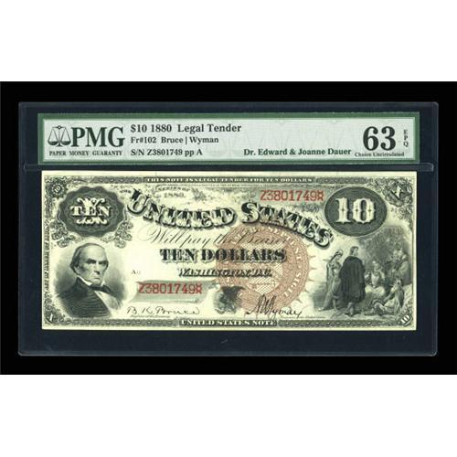 <B>Fr. 102 $10 1880 Legal Tender PMG Choice Uncirculated 63 EPQ.</B></I> Photographed on page 86 of the Dauers' book, this Large Brown Seal Red Serial Number Jackass Ten has earned itself the coveted "Exceptional Paper Quality" comment. The 63 grade is no doubt a product of the very tight left face margin. Track & Price shows the census for this number to be an even 100 notes. We sold a PMG 64 in May for $3,200 and we would expect this note to do just about the same. <BR><I>From The Dr. Edward & Joanne Dauer Collection</B></I><BR><BR><b>Shipping:</b> Coins & Currency (<a target="_blank" href="http://www.heritageauctions.com/common/shipping.php">view shipping information</a>)