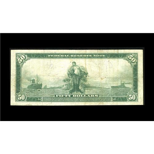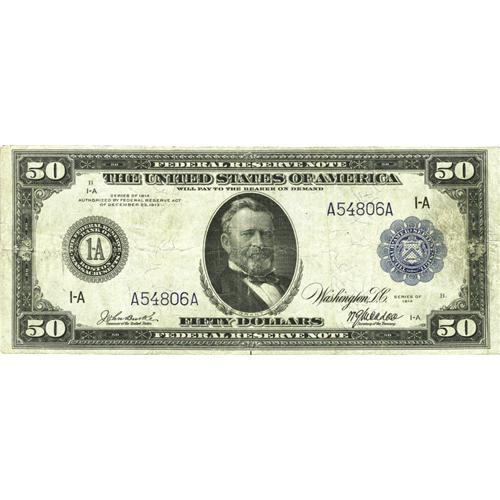 <B>Fr. 1024 $50 1914 Federal Reserve Note Fine+.</B></I> This tougher issue rarely makes its presence felt in our sales.