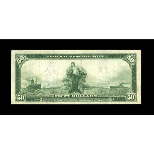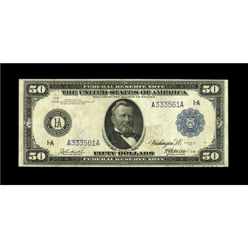 <B>Fr. 1024 $50 1914 Federal Reserve Note Very Fine.</B></I> This example rarely is seen, but tonight we have the pleasure of offering two. A little roughness is noticed along the margin at bottom right.<BR><BR><b>Shipping:</b> Coin/Currency (<a target="_blank" href="http://www.heritageauctions.com/common/shipping.php">view shipping information</a>)