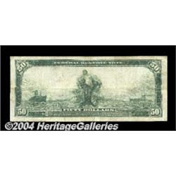 Fr. 1024 $50 1914 Federal Reserve Note Very Fine. Only the fourth example we've sold out of a total census in the teens. The surfaces are strictly original, and the note is problem free for the grade. In this rather nice condition, a note this rare will likely realize . . . <BR><BR><B>Important notice:</B> Heritage usually auctions material at the rate of 200-250 lots per hour. On some occasions eBay Live bid software or the Internet may not be able to keep up with the pace of the auction. We recommend placing a realistic absentee bid now as insurance to avoid disappointment. Occasionally the auctioneer may eliminate or reject an eBay Live bid, and the auctioneer may also reopen a lot after the close of the eBay live bidding (usually because we missed an audience bid), and may reject your bid even if it shows you as the winning bidder. By bidding via eBay Live, you agree that Heritage may award the lot to another bidder at its sole discretion under the circumstances described above or any other reasonable circumstances. Since eBay bids are not shown to us until we open the lot on the floor, we treat those bids just like floor bids. In most cases the floor responds before the eBay bid is presented to us, due to Internet lag time, so for consistency we have made it a policy that floor bids are always considered first over tie eBay live bids. Also please note that all Heritage lots purchased through eBay Live carry a 20% Buyer's Premium. Please make sure you read the Terms and Conditions before you bid. <BR><BR><B>IMPORTANT ANNOUNCEMENT ABOUT RESERVES:</B> Heritage now divulges all reserves on its web site 7 days before every auction. If you want to know whether the reserve on this lot has been met, and if not, what the reserve amount is, please visit this lot page on the HeritageCoin.com web site, or email: bid@HeritageGalleries.com