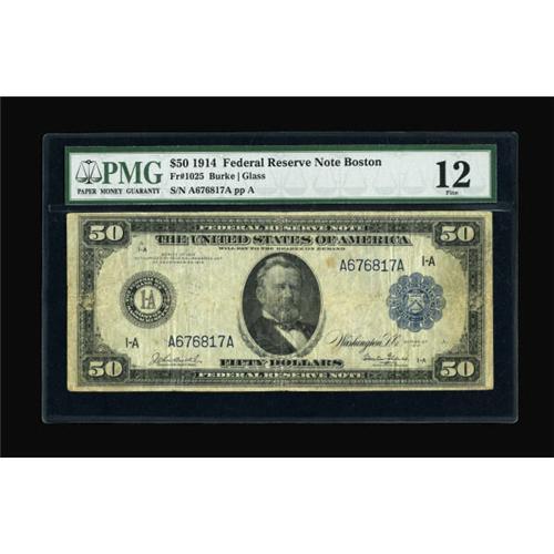 <B>Fr. 1025 $50 1914 Federal Reserve Note PMG Fine 12.</B></I> About two dozen representatives of this issue have been reported to census takers. This piece is solid, despite its grade.<BR><BR><b>Shipping:</b> Coins & Currency (<a target="_blank" href="http://www.heritageauctions.com/common/shipping.php">view shipping information</a>)