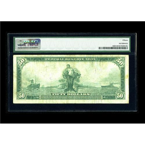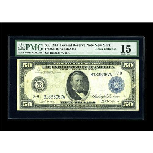 <B>Fr. 1028 $50 1914 Federal Reserve Note PMG Choice Fine 15.</B></I> This mid-grade note faces up very well. Over time it acquired a few pinholes in the portrait area. About forty pieces are known to collectors though only about half are available to collectors or have ever appeared for sale. <BR><I>Ex: Rickey Collection</B></I><BR><BR><b>Shipping:</b> Coin/Currency (<a target="_blank" href="http://www.heritageauctions.com/common/shipping.php">view shipping information</a>)