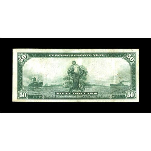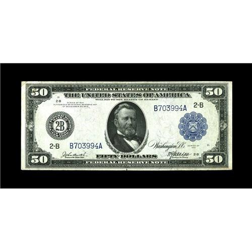 <B>Fr. 1028 $50 1914 Federal Reserve Note Very Fine.</B></I> A little flatness is seen on this New York $50 blue seal that remains bright.