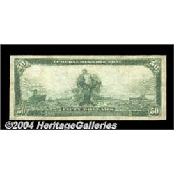 Fr. 1028 $50 1914 Federal Reserve Note Fine-Very Fine. The sixth example that CAA has sold out of a census in the high teens. Problem free save for a small area of paper-clip rust at the bottom of the face. Scarce enough to attract some serious bids. <BR><BR><B>Important notice:</B> Heritage usually auctions material at the rate of 200-250 lots per hour. On some occasions eBay Live bid software or the Internet may not be able to keep up with the pace of the auction. We recommend placing a realistic absentee bid now as insurance to avoid disappointment. Occasionally the auctioneer may eliminate or reject an eBay Live bid, and the auctioneer may also reopen a lot after the close of the eBay live bidding (usually because we missed an audience bid), and may reject your bid even if it shows you as the winning bidder. By bidding via eBay Live, you agree that Heritage may award the lot to another bidder at its sole discretion under the circumstances described above or any other reasonable circumstances. Since eBay bids are not shown to us until we open the lot on the floor, we treat those bids just like floor bids. In most cases the floor responds before the eBay bid is presented to us, due to Internet lag time, so for consistency we have made it a policy that floor bids are always considered first over tie eBay live bids. Also please note that all Heritage lots purchased through eBay Live carry a 20% Buyer's Premium. Please make sure you read the Terms and Conditions before you bid. <BR><BR><B>IMPORTANT ANNOUNCEMENT ABOUT RESERVES:</B> Heritage now divulges all reserves on its web site 7 days before every auction. If you want to know whether the reserve on this lot has been met, and if not, what the reserve amount is, please visit this lot page on the HeritageCoin.com web site, or email: bid@HeritageGalleries.com