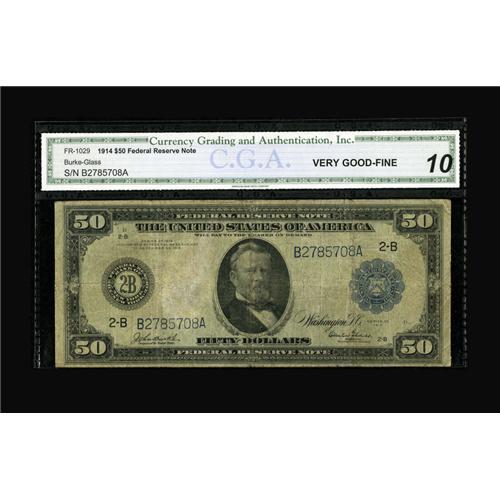 <B>Fr. 1029 $50 1914 Federal Reserve Note CGA Very Good-Fine 10.</B></I> There are less than 30 examples of this Friedberg number, with this a new number to both the Gengerke and Track & Price census tools.<BR><BR><b>Shipping:</b> Coins & Currency (<a target="_blank" href="http://www.heritageauctions.com/common/shipping.php">view shipping information</a>)