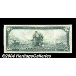Fr. 1029 $50 1914 Federal Reserve Note Choice New. This is only the second time CAA has handled this Friedberg number, and it's a repeat of this same note from several years ago. The total number of known examples stands at a half-dozen, and this may well be the finest of them. Rare Federal Reserve notes, in spite of their recent increases, remain in our opinion extremely underpriced. If just a few more collectors were to enter the field, better numbers would be come practically unobtainable. <BR><BR><B>Important notice:</B> Heritage usually auctions material at the rate of 200-250 lots per hour. On some occasions eBay Live bid software or the Internet may not be able to keep up with the pace of the auction. We recommend placing a realistic absentee bid now as insurance to avoid disappointment. Occasionally the auctioneer may eliminate or reject an eBay Live bid, and the auctioneer may also reopen a lot after the close of the eBay live bidding (usually because we missed an audience bid), and may reject your bid even if it shows you as the winning bidder. By bidding via eBay Live, you agree that Heritage may award the lot to another bidder at its sole discretion under the circumstances described above or any other reasonable circumstances. Since eBay bids are not shown to us until we open the lot on the floor, we treat those bids just like floor bids. In most cases the floor responds before the eBay bid is presented to us, due to Internet lag time, so for consistency we have made it a policy that floor bids are always considered first over tie eBay live bids. Also please note that all Heritage lots purchased through eBay Live carry a 20% Buyer's Premium. Please make sure you read the Terms and Conditions before you bid. <BR><BR><B>IMPORTANT ANNOUNCEMENT ABOUT RESERVES:</B> Heritage now divulges all reserves on its web site 7 days before every auction. If you want to know whether the reserve on this lot has been met, and if not, what the reserve amount is, please visit this lot page on the HeritageCoin.com web site, or email: bid@HeritageGalleries.com