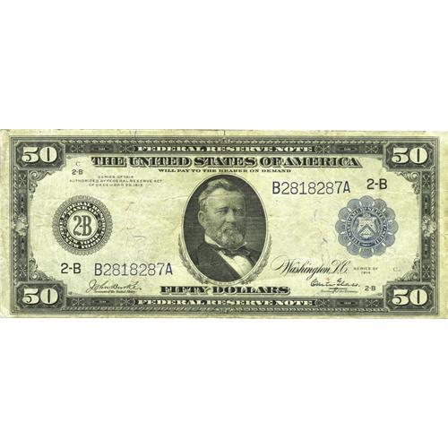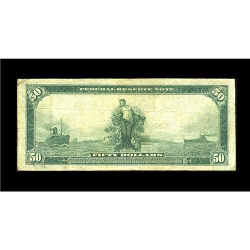 <B>Fr. 1029 $50 1914 Federal Reserve Note Fine+.</B></I> A little over 20 examples are reported for this harder signature combination. Despite the handling seen this note retains much color.