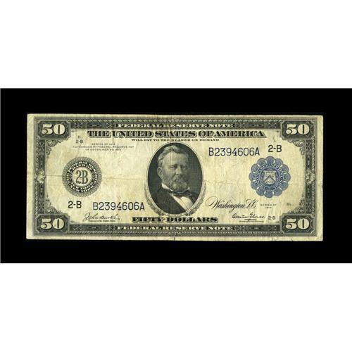 <B>Fr. 1029 $50 1914 Federal Reserve Note Fine.</B></I> We are fortunate to offer yet another example of this elusive high denomination.<BR><BR><b>Shipping:</b> Coin/Currency (<a target="_blank" href="http://www.heritageauctions.com/common/shipping.php">view shipping information</a>)