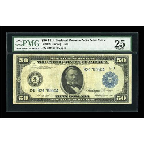 <B>Fr. 1029 $50 1914 Federal Reserve Note PMG Very Fine 25.</B></I> Fewer than three dozen examples of this issue are known in currency circles, and a quick survey of the census indicates only two finer specimens are known. This piece is a pleasing mid-grade example with nothing more than a couple of pinholes.<BR><BR><b>Shipping:</b> Coins & Currency (<a target="_blank" href="http://www.heritageauctions.com/common/shipping.php">view shipping information</a>)