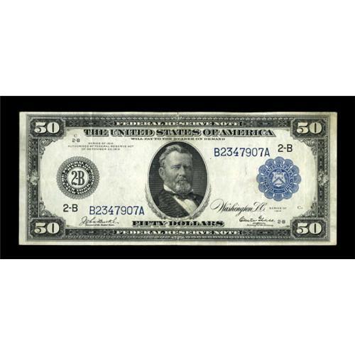 <B>Fr. 1029 $50 1914 Federal Reserve Note Very Fine.</B></I> Solid margins and bright paper are noted on this New York District note.<BR><BR><b>Shipping:</b> Coins & Currency (<a target="_blank" href="http://www.heritageauctions.com/common/shipping.php">view shipping information</a>)