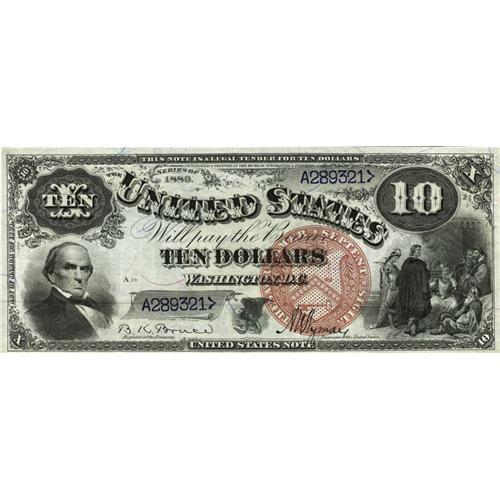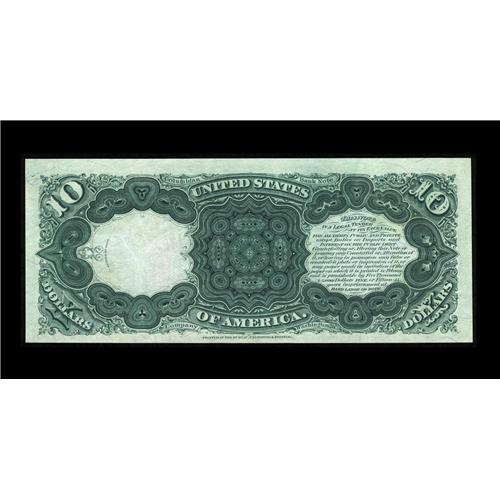 <B>Fr. 103 $10 1880 Legal Tender Gem New.</B></I> Nearly every detail of the bold red seal is seen on the back since it was sold boldly impressed on the paper. The margins are ample for Gem though three are nothing short of behemoth. A hint of handling is noted, but does nothing to limit the grade of the note or the eye appeal.<BR><I>From The Plymouth Rock Collection</B></I>