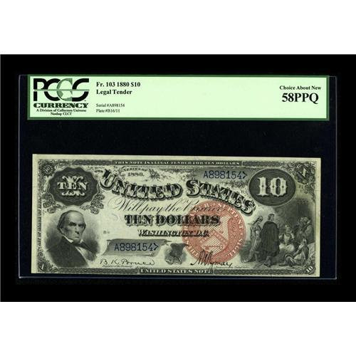 <B>Fr. 103 $10 1880 Legal Tender PCGS Choice About New 58PPQ.</B></I> A broad corner at lower left is all that keeps this well embossed and colorful "Jackass" from a higher grade. These Large Red Seal examples are tough to find in any grade with less than 80 survivors extant.<BR><BR><b>Shipping:</b> Coin/Currency (<a target="_blank" href="http://www.heritageauctions.com/common/shipping.php">view shipping information</a>)