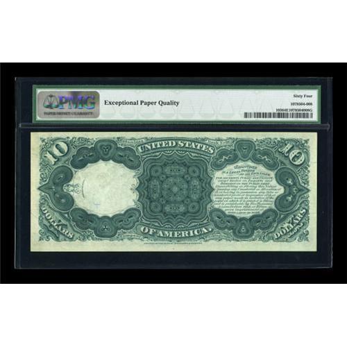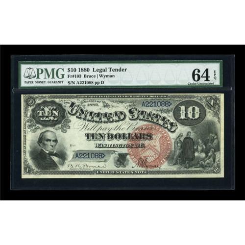 <B>Fr. 103 $10 1880 Legal Tender PMG Choice Uncirculated 64 EPQ.</B></I> Here is another fresh and pleasing Jackass that has been off the market for a number of years. Plenty of embossing remains along with deep color, but it is held back from a higher grade due a thin upper margin.<B><BR></B></I><I>From The Drew Keough Collection</B></I><BR><BR><b>Shipping:</b> Coins & Currency (<a target="_blank" href="http://www.heritageauctions.com/common/shipping.php">view shipping information</a>)