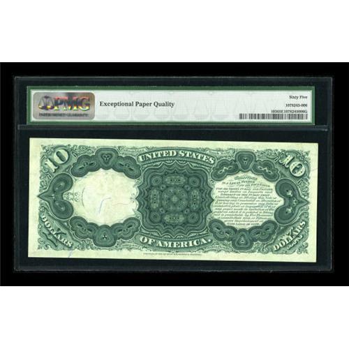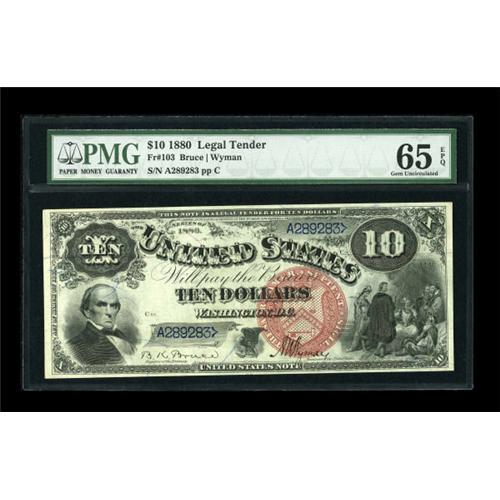 <B>Fr. 103 $10 1880 Legal Tender PMG Gem Uncirculated 65 EPQ.</B></I> PMG has graded seven notes at this 65 EPQ level, and only three are graded higher. This Large Round Red Seal Ten often comes with the seal color somewhat faded. It is simply beautiful on this one, and that, combined with the broad margins and clearly original surfaces, earn this note its full Gem grade. <BR><I>From The John Ameen Collection</B></I><BR><BR><b>Shipping:</b> Coins & Currency (<a target="_blank" href="http://www.heritageauctions.com/common/shipping.php">view shipping information</a>)