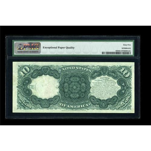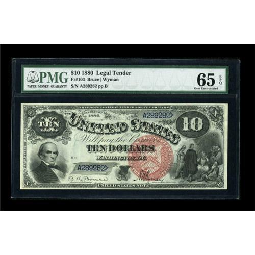 <B>Fr. 103 $10 1880 Legal Tender PMG Gem Uncirculated 65 EPQ.</B></I> The original embossing on the seal is so heavy that it can be viewed easily through the holder. The colors are excellent and the note has a wonderfully, fresh overall appearance. Actually a scarce number in high grade--the presence of so many nice examples in this sale notwithstanding.<BR><I>From The John Ameen Collection</B></I><BR><BR><b>Shipping:</b> Coins & Currency (<a target="_blank" href="http://www.heritageauctions.com/common/shipping.php">view shipping information</a>)