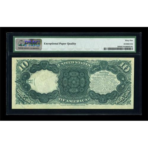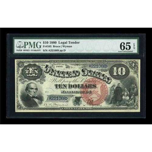 <B>Fr. 103 $10 1880 Legal Tender PMG Gem Uncirculated 65 EPQ.</B></I> This is a lovely example, with deep, original embossing, bright color of the inks and paper and excellent surfaces, without a hint of a problem of any kind. Fr. 103 is the most common of the three Large Round Red Seal Blue Serial Number Jackass signature combinations. Only around 175 examples are known for all three numbers combined, making this a rather scarce type, particularly in top grade. <BR><BR><b>Shipping:</b> Coins & Currency (<a target="_blank" href="http://www.heritageauctions.com/common/shipping.php">view shipping information</a>)