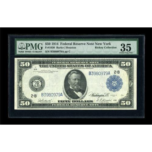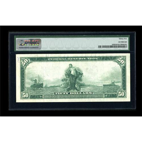 <B>Fr. 1030 $50 1914 Federal Reserve Note PMG Choice Very Fine 35.</B></I> Even margins and sharp corners are noted on this lightly circulated issue. A stray pen mark is noted in the margin on the reverse.<BR><BR><b>Shipping:</b> Coins & Currency (<a target="_blank" href="http://www.heritageauctions.com/common/shipping.php">view shipping information</a>)